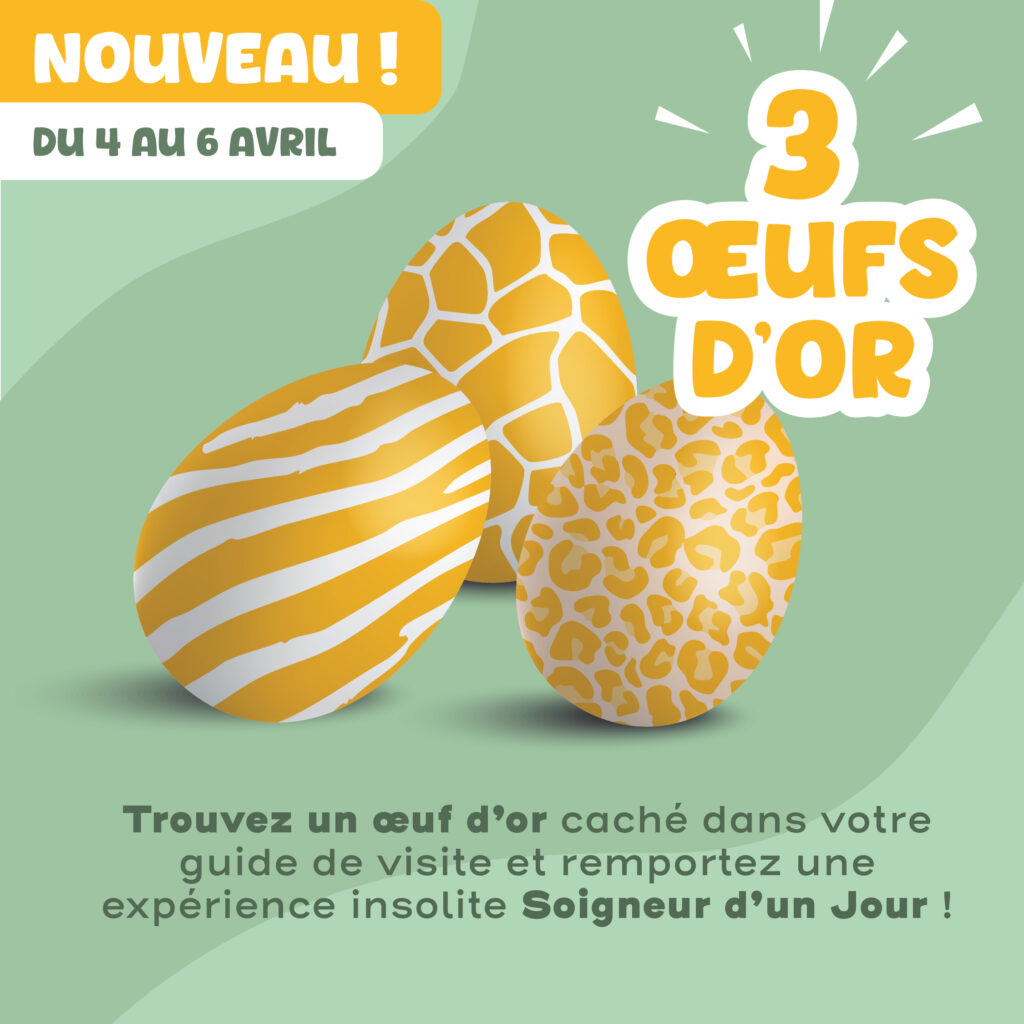 Du 4 au 6 avril, pendant les trois jours de chasse aux œufs, trois œufs d’or seront dissimulés dans les guides de visite distribués à l’entrée du parc animalier. Les heureux gagnants remporteront une expérience VIP « Soigneur d’un jour », valable pour un.e adulte. Une opportunité de visiter les coulisses du zoo et de découvrir le métier de soigneur animalier.
